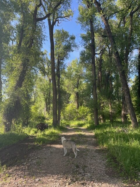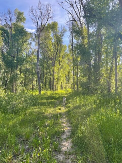 In 2017, I moved from Rwanda to my husband’s family ranch in Wyoming. It is remote, isolated, and bathed in nature. The YL Ranch sits at the end of the Savery Creek Valley. It abuts BLM land, Big Sandstone, Little Sandstone, and the Medicine Bow National Forest. Every morning when I am here, Shaka and I walk. We walk the .75-mile loop along the Savery Creek on our property, through Water Conservation land, and around BLM back to the ranch. In one section, I feel like I’m walking down a long aisle of a 16th-century European church. The trees rising high on both sides, the long grass coming alongside as I walk the well-worn path breathing in the scents of summer. I’ve come across bears, moose, deer, elk, bobcats, and coyotes on my daily walks. Each time sparking a moment of “awe” and gratitude radiating throughout my body.